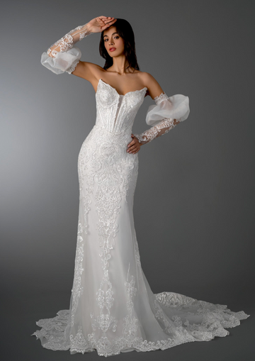 A sophisticated and timeless choice, this floor-length gown features a fitted bodice adorned with intricate...