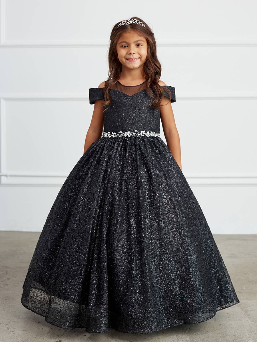 Glitter Illusion Sweetheart Neckline Off Shoulder Dress with Floral Rhinestone Waist. Floor Length. Zipper-Back, No Corset Ties.