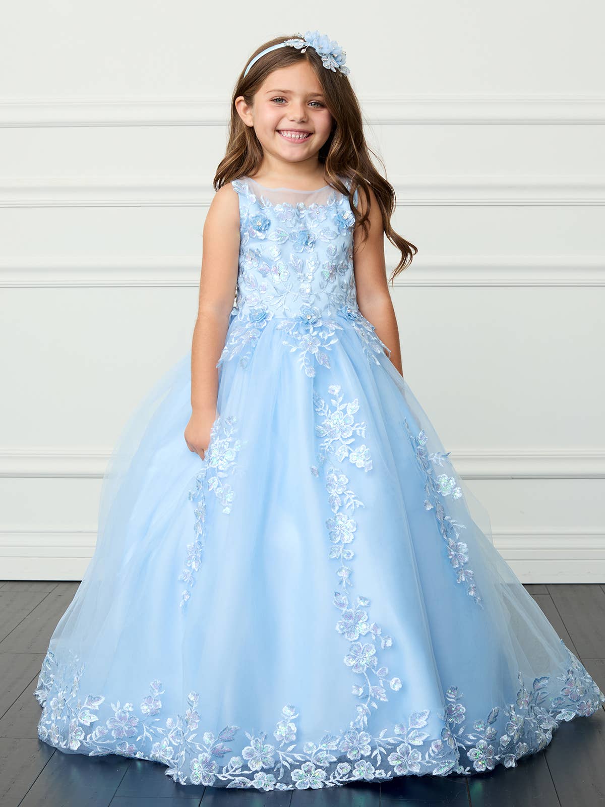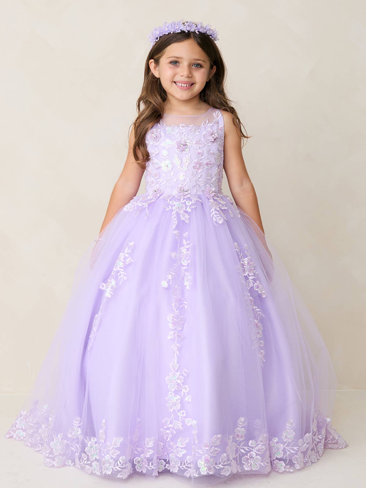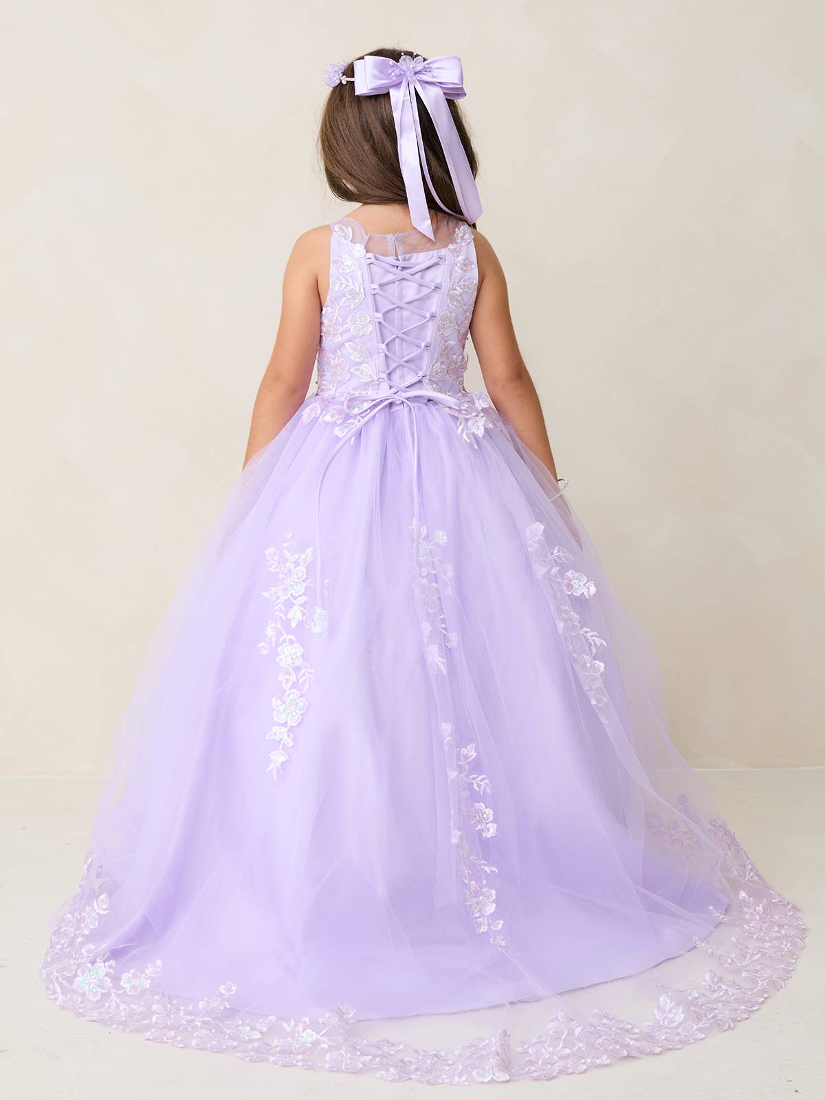 Gorgeous iridescent lace applique bodice with a illusion neckline bodice. The skirt features lace applique with a long tail. It has a rear center zipper and a corset tie back.